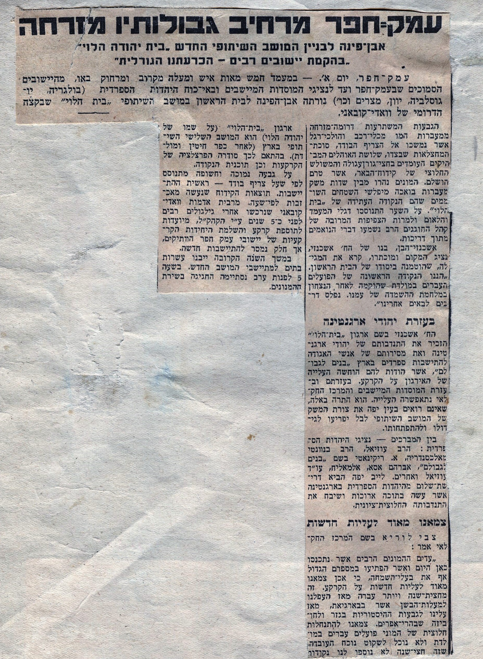 ביום י״ד באב תש״ה (12 באוגוסט 1945) נערך טקס חגיגי לציון תחילתו של תהליך ההתיישבות במושב בית הלוי, על אדמות קַבָּאנִי שבמזרח עמק חפר – שטח חקלאי נרחב ורווי ביצות שיובש והוכשר לקראת בנייה.